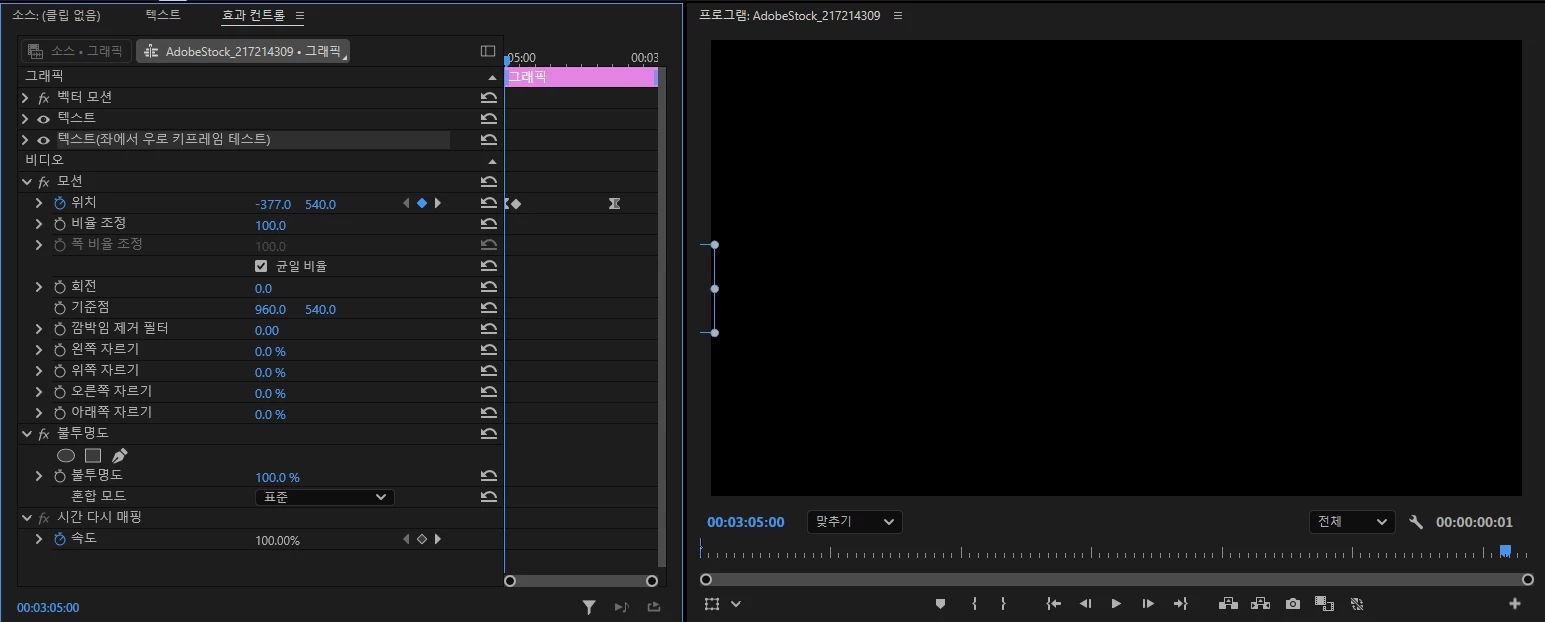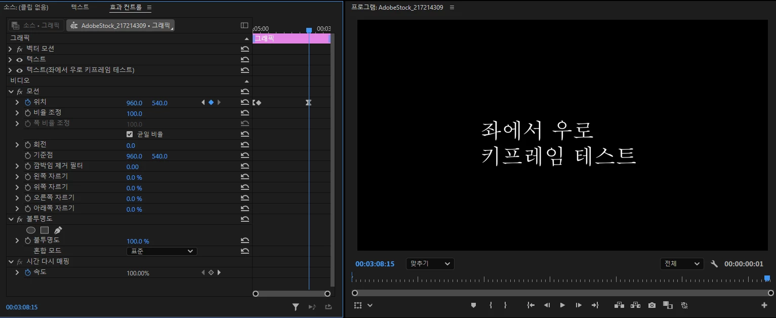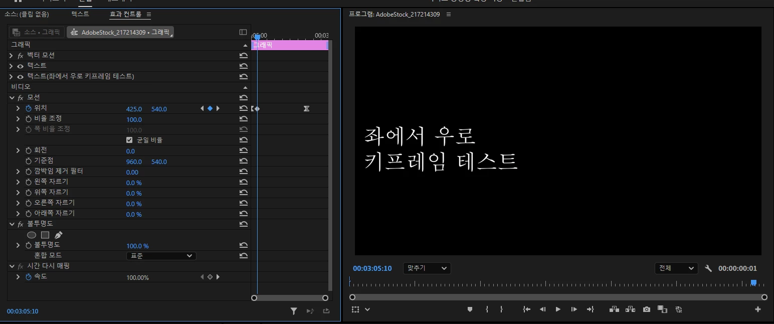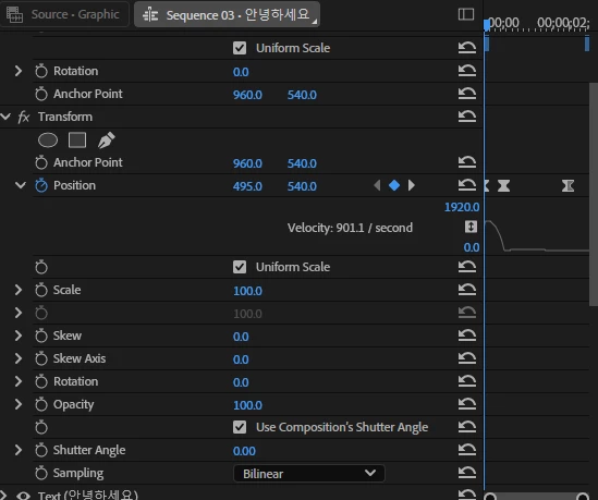 자막 모션 연습 중인데요. 바깥에서부터 처음에는 빠르게 들어오고 서서히 속도가 줄어들게 하는 모션을 주고싶어서요. 자막에 transform 효과를 주고 position에 키프레임을 총 3개를 잡았는데요. 마지막에 원하는 위치에서 멈추는게 아니라 다시 원래 위치쪽으로 이동을 하네요.. 제가 키프레임을 따로 잡은 것도 없는데 왜 계속 이동을 하고 원래 위치로 가는건가요??