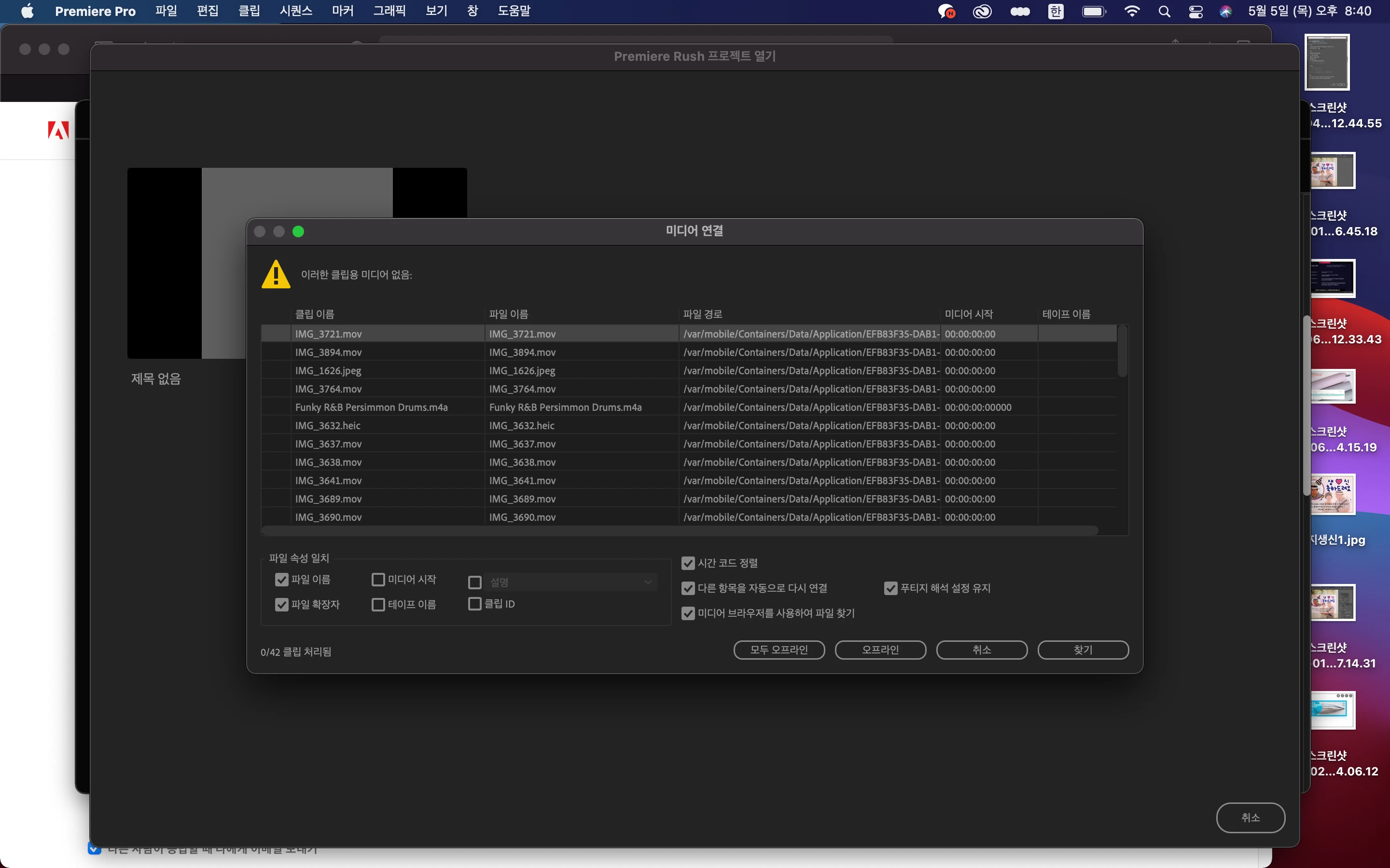휴대폰 프리미어 러쉬에서 작업한 동영상을 프리미어 프로(pc)에서 연동하려고 하면 소스가 없다고